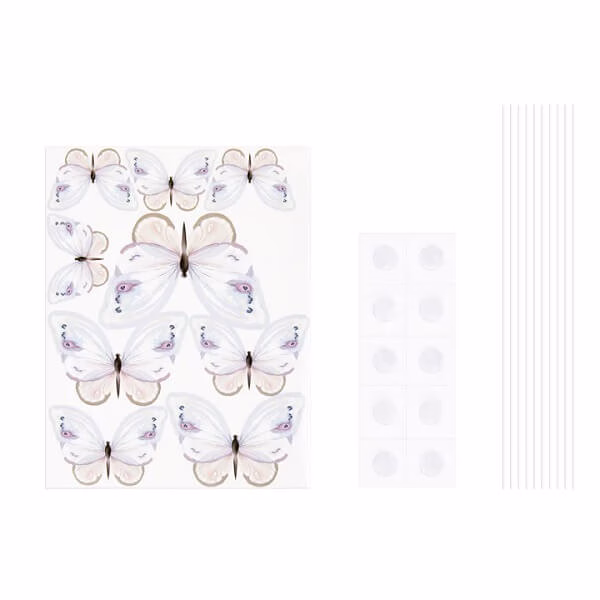 - Комплектът включва: 9 броя хартиени пеперуди с различни размери, 9 броя гъвкави пръчици, 10 броя лепилни точки