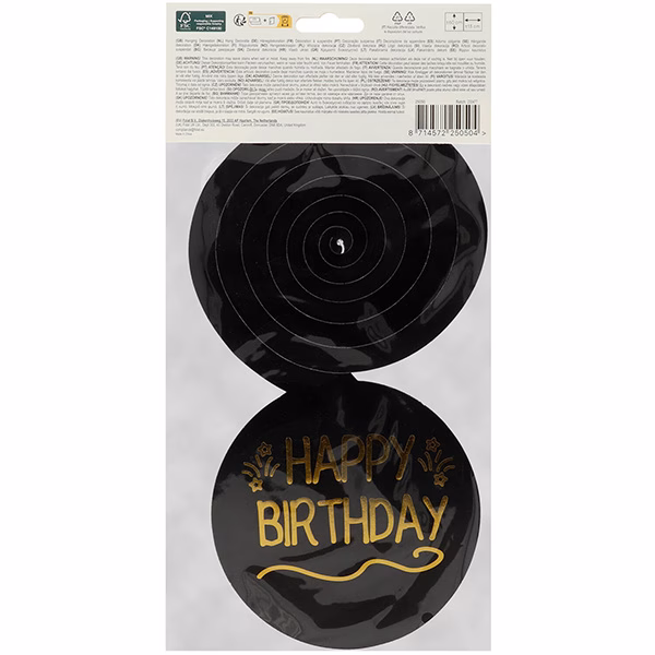 Весела пружинираща висяща украса за отбелязване на рожден ден. Висящата украса е отпечатана от двете страни в черно с шарката Shining Glam и текс Happy Birthday в златисто. Това злато наистина блести благодарение на използваната техника на топъл печат. Декорацията е с памучна примка 30см за закачане. Тази висяща украса е част от колекцията Shining Glam на Folat. Този артикул е направен от FSC хартия.